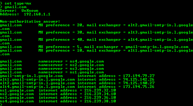 4. Now just type "set type=mx" - this will force NSLOOKUP to shows Mail eXchange records from the DNS servers.